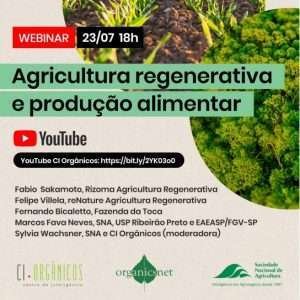Os debates serão coordenados pela diretora da SNA, Sylvia Wachsner. O webinar será realizado em 23 de julho, a partir das 18h. Para participar, acesse o link no You Tube CI Orgânicos https://bit.ly/2YK03o0.