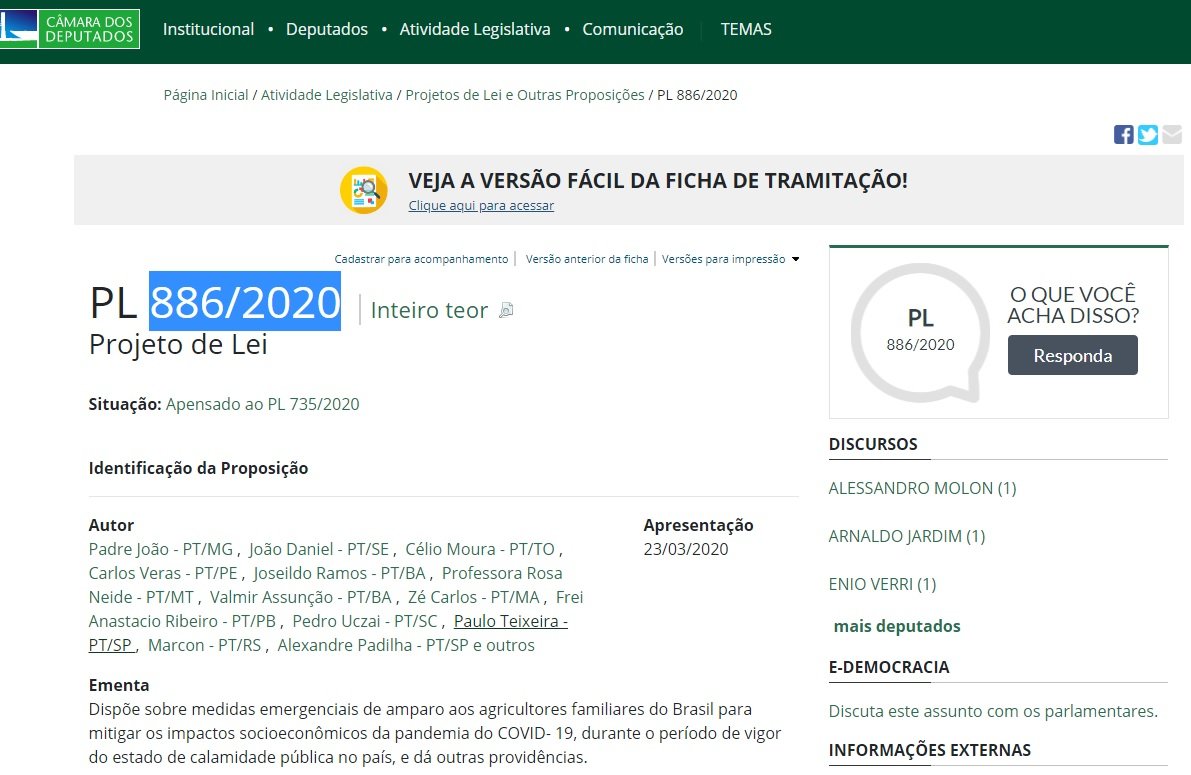 A Câmara dos Deputados deve analisar nesta semana o projeto de lei (PL) 886/2020, reunindo um conjunto de medidas emergenciais para apoio à agricultura familiar durante o período de pandemia causada pelo novo coronavírus.