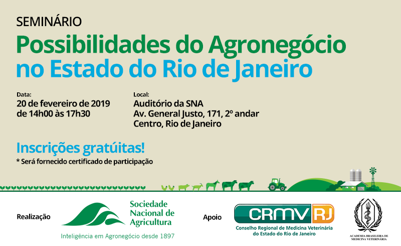 A Sociedade Nacional de Agricultura (SNA), em parceria com o Conselho Regional de Medicina Veterinária do Rio de Janeiro (CRMV-RJ) e a Associação Brasileira de Medicina Veterinária (Abramvet), realizam o seminário “Possibilidades do Agronegócio no Estado do Rio de Janeiro”.