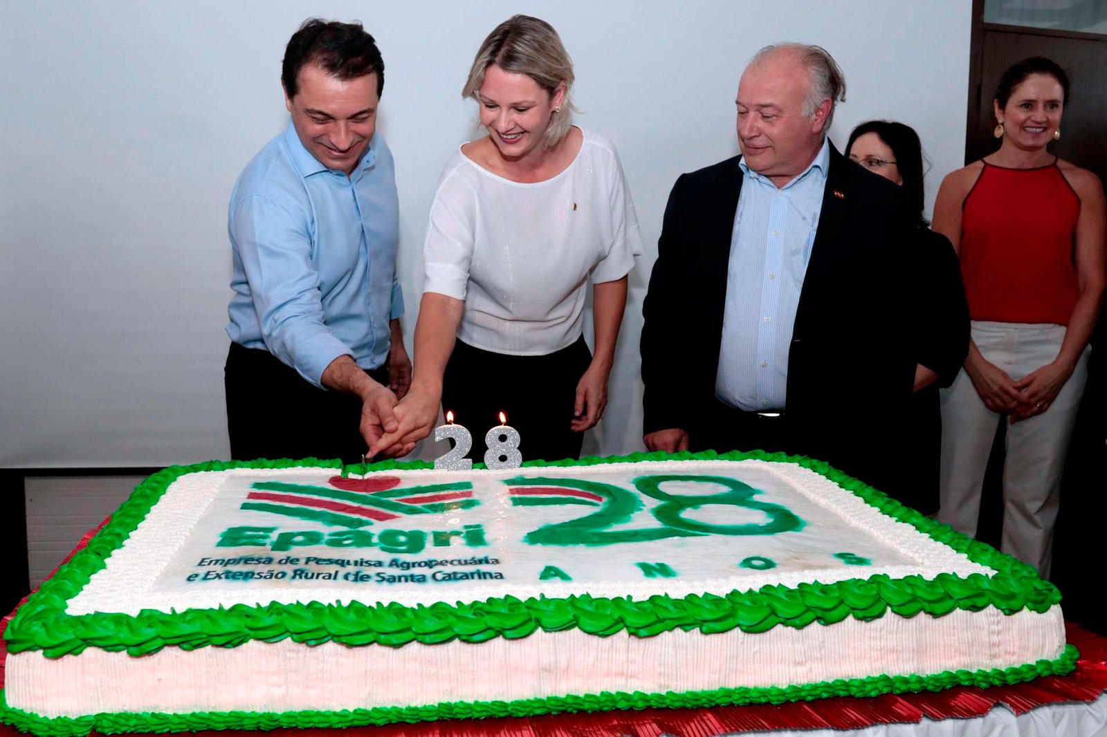 Governador de SC, Carlos Moisés, e a presidente da Epagri, Edilene Steinwandter, cortam bolo em comemoração de 28 anos da estatal de pesquisa, ao lado do o secretário da Agricultura do Estado, Ricardo de Gouvêa. Foto: Mauricio Vieira/Divulgação Secom-SC