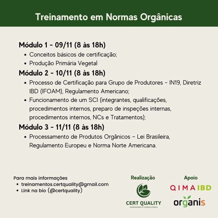 O treinamento é organizado e realizado pela empresa Cert Quality e terá como foco as atualizações das normas orgânicas de produção brasileira da Portaria 52, Novo Regulamento Europeu CE e Normas Norte-americanas NOP, voltando-se principalmente para Produção Primária Vegetal (PPV), Processamento de Origem Vegetal (POV) e Grupo de Produtores.