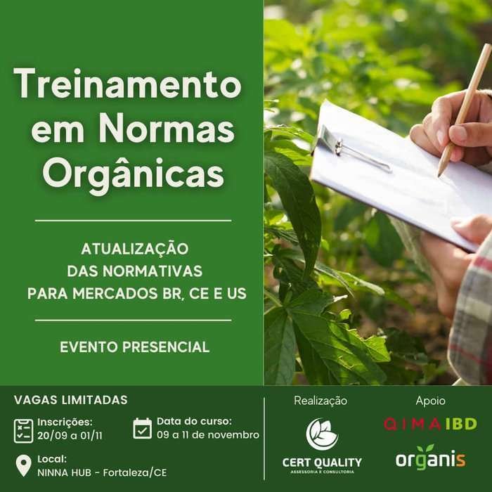 É com satisfação que o IBD Certificações em parceria com a Cert Quality Assessoria e Consultoria, convida você a participar do Treinamento em Normas Orgânicas, a ser realizado no período de 09 a 11 de novembro de 2022, em Fortaleza-CE, no formato presencial.